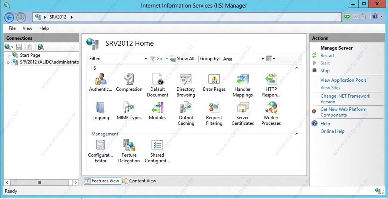 IIS ile ilgili tüm ayarları yapacağımız menü sağ taraftada görüldüğü gibi Manage server bölümünde Server Start durumunda.